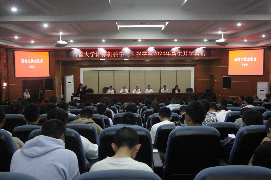 其次,傅倬淞博士和郭玉洁老师先是代表教职工向全体新生表达了热烈欢迎和诚挚祝贺。他们指出作为计算机专业的员工,在人工智能与数字技术快速发展的新时代,大家将面临机遇与挑战。他们鼓励同学们勇敢面对挑战,积极拥抱变化,在探索实践中培养创新能力。同时,他们期望同学们珍惜大学时光,努力追求学术卓越,为实现个人梦想而不断奋斗。