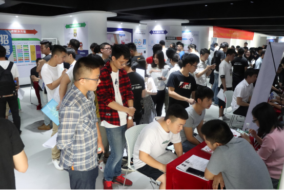 德创智谷一楼展厅内人头攒动,二百多名员工在这里寻找一份自己满意的offer,想为自己谋得一个美好的未来。在每个企业的展台前都排起了长龙,企业的HR们面对同学们的询问,耐心地解答应聘同学的疑惑。同学们拿着准备好的简历,满怀期待的在一家家企业展台前浏览。
